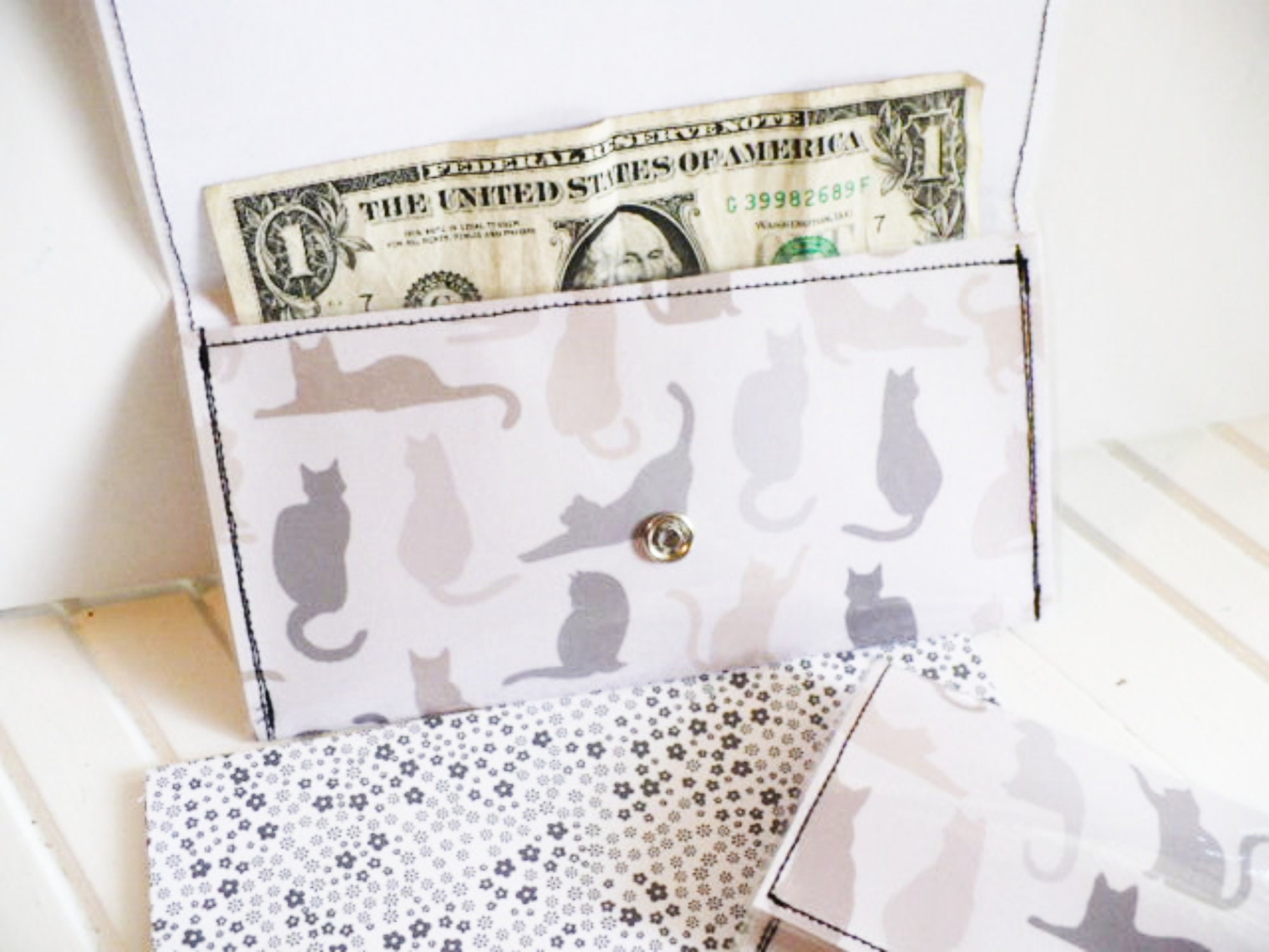 These cute handmade cat wallets come in two sizes. You can choose either the larger 3.25 x 7-inch wallet.