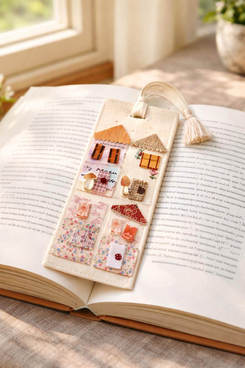 Make an adorable bookmark with this folk art tiny house slow stitch kit. It comes with everything you need to make your next project whimsical. The picture is just an example. You will not be getting these exact pieces of fabric.