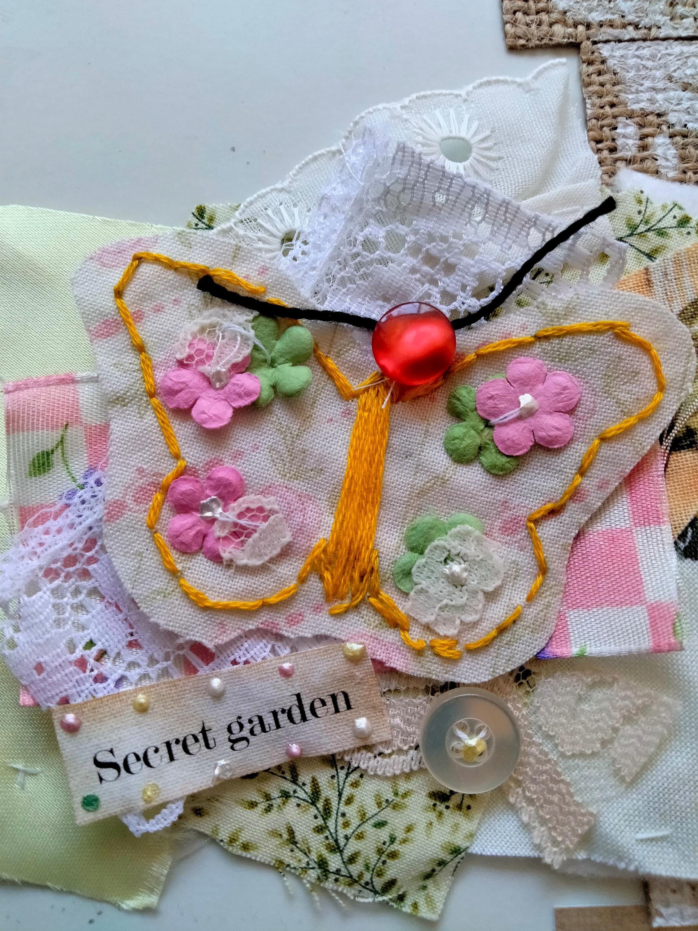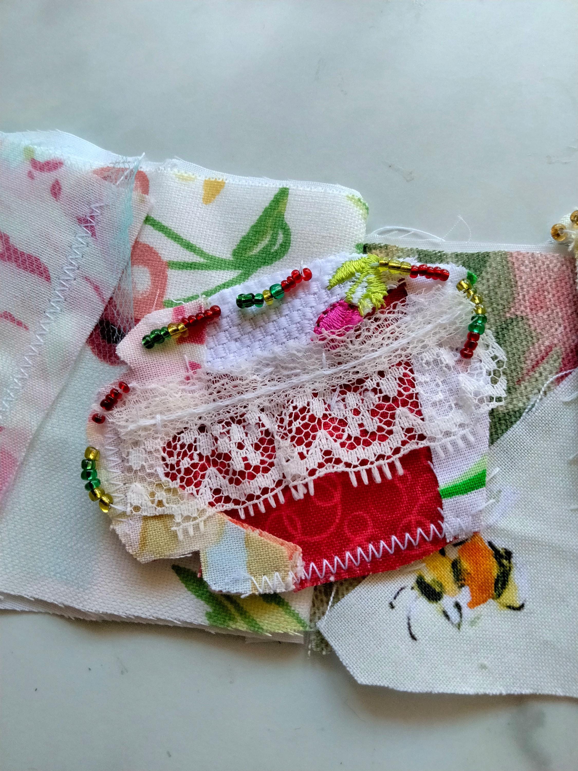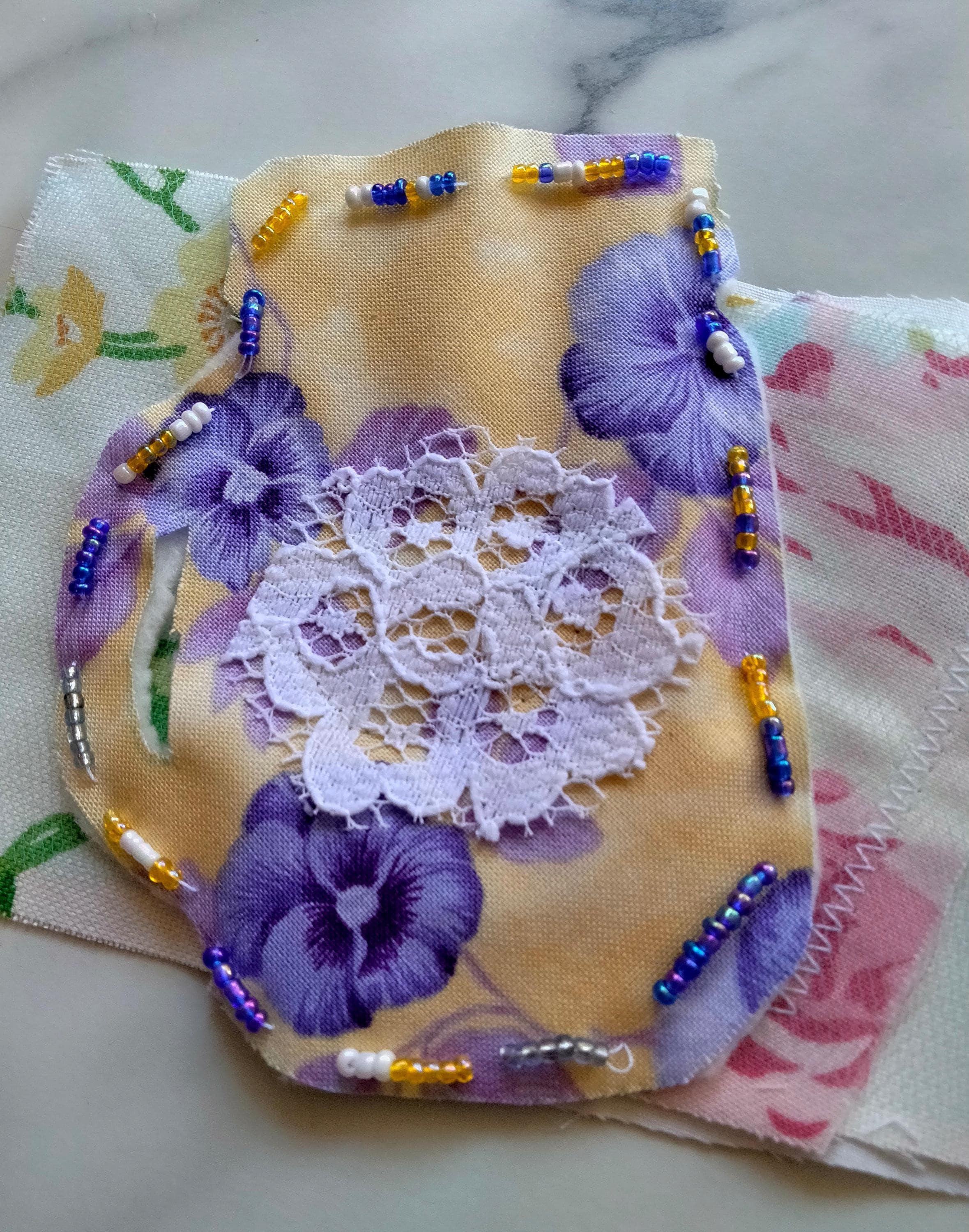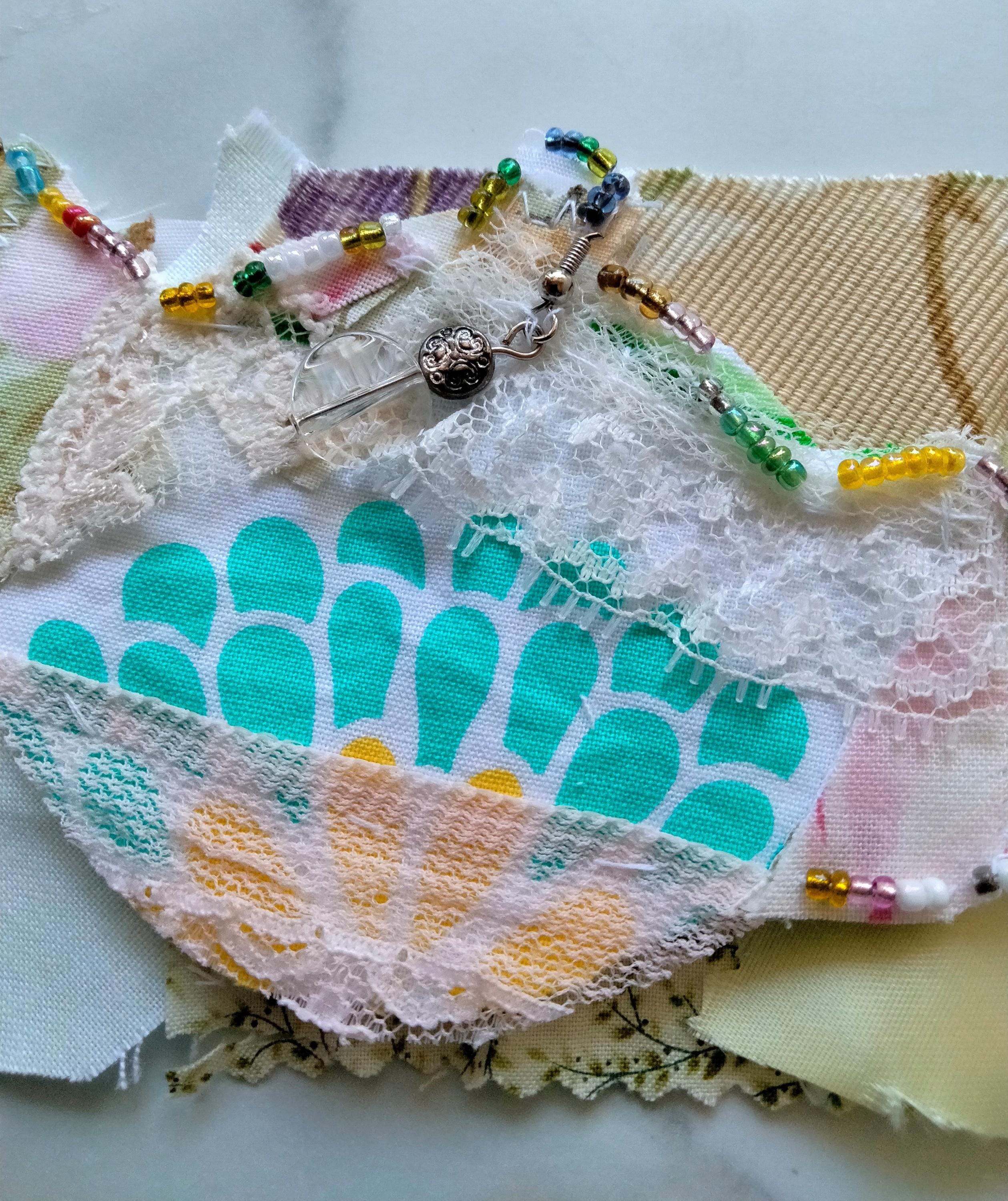 • Beautifully curated vintage fabrics, lace, buttons, and handmade fabric yoyos with seed beads and modern tiny charms (charms vary between kits)