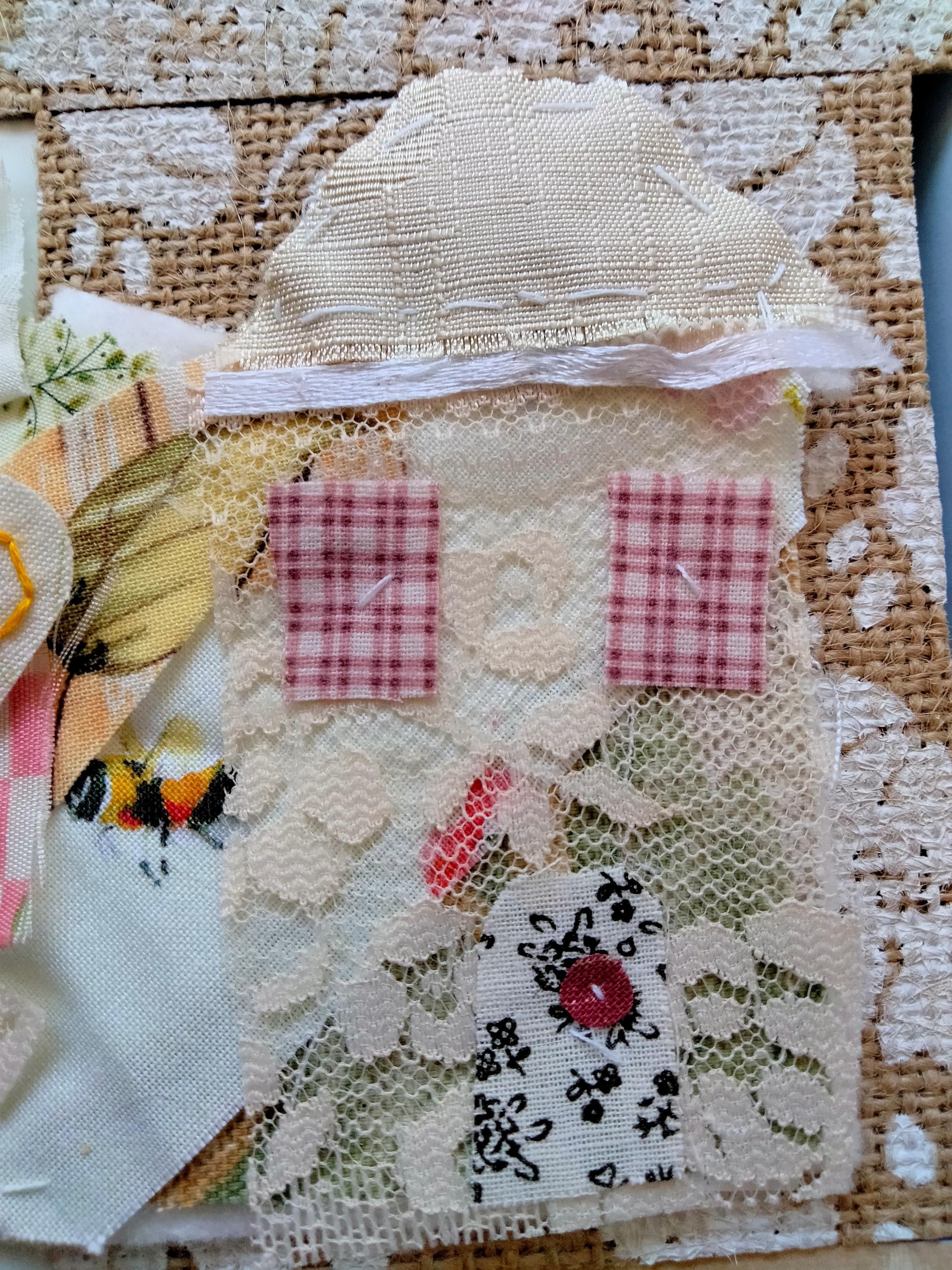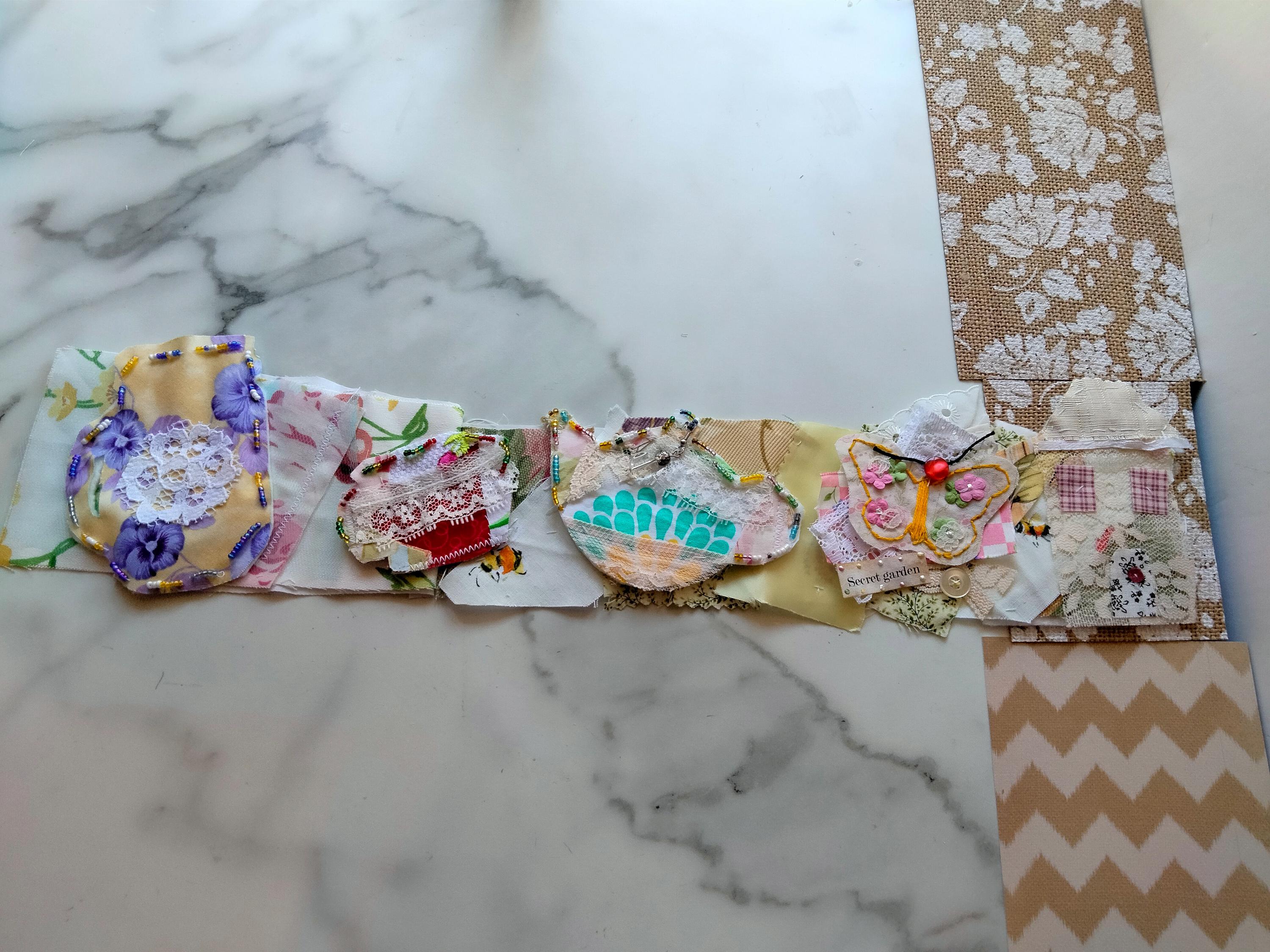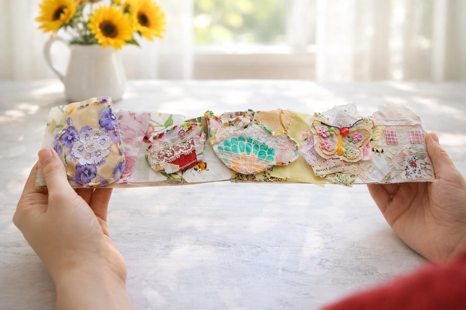 Embrace your creativity with this charming slow stitch kit snippet roll fabric collection featuring vintage embellishments and handmade appliques perfect for quilting gifts and craft projects. The delightful collection includes mason jar, butterfly, teapot, teacup, and tiny house patterns enhanced with carefully curated vintage fabrics, lace, buttons, and handmade fabric yoyos for your next textile art project.