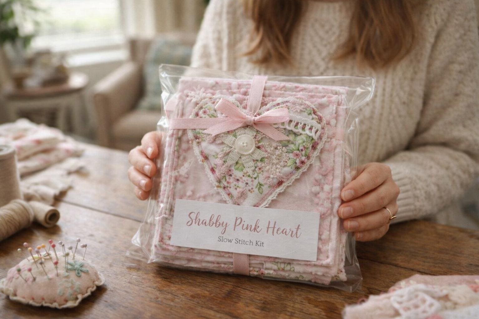 * Shabby chic supplies: Create beautiful, vintage-inspired embroidery projects with our curated collection of pink, white, and cream fabric scraps, lace, ribbon, and buttons.