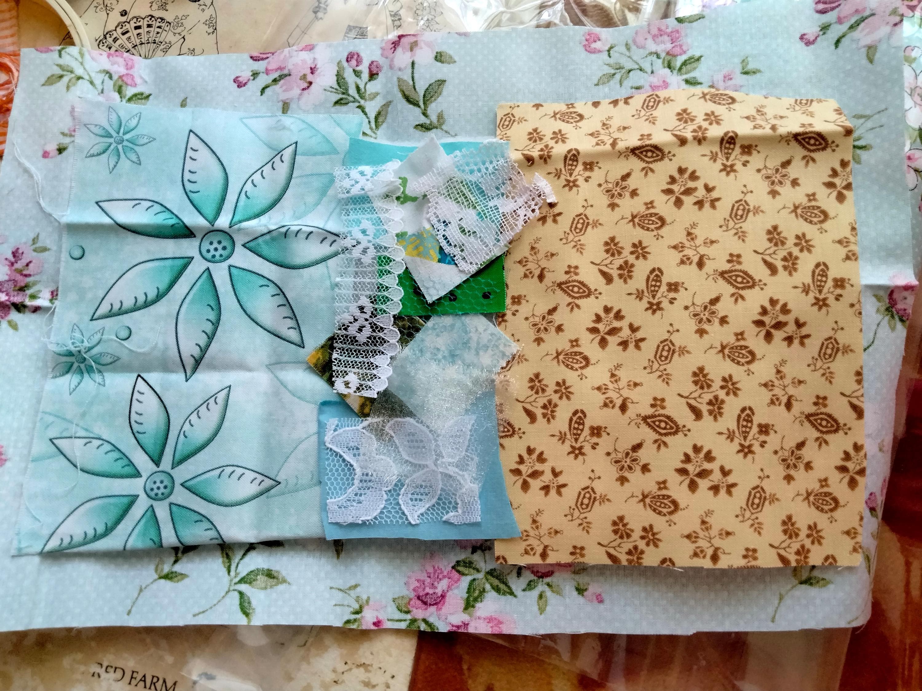features a selection of supplies perfect for creating your own junk journal or embroidery practice book with beautiful, crazy quilt block designs. Complete your craft project with an optional handmade storage box that keeps everything organized, while the green table runner-style base offers an unfinished textile art canvas ready for your personal creative touches.