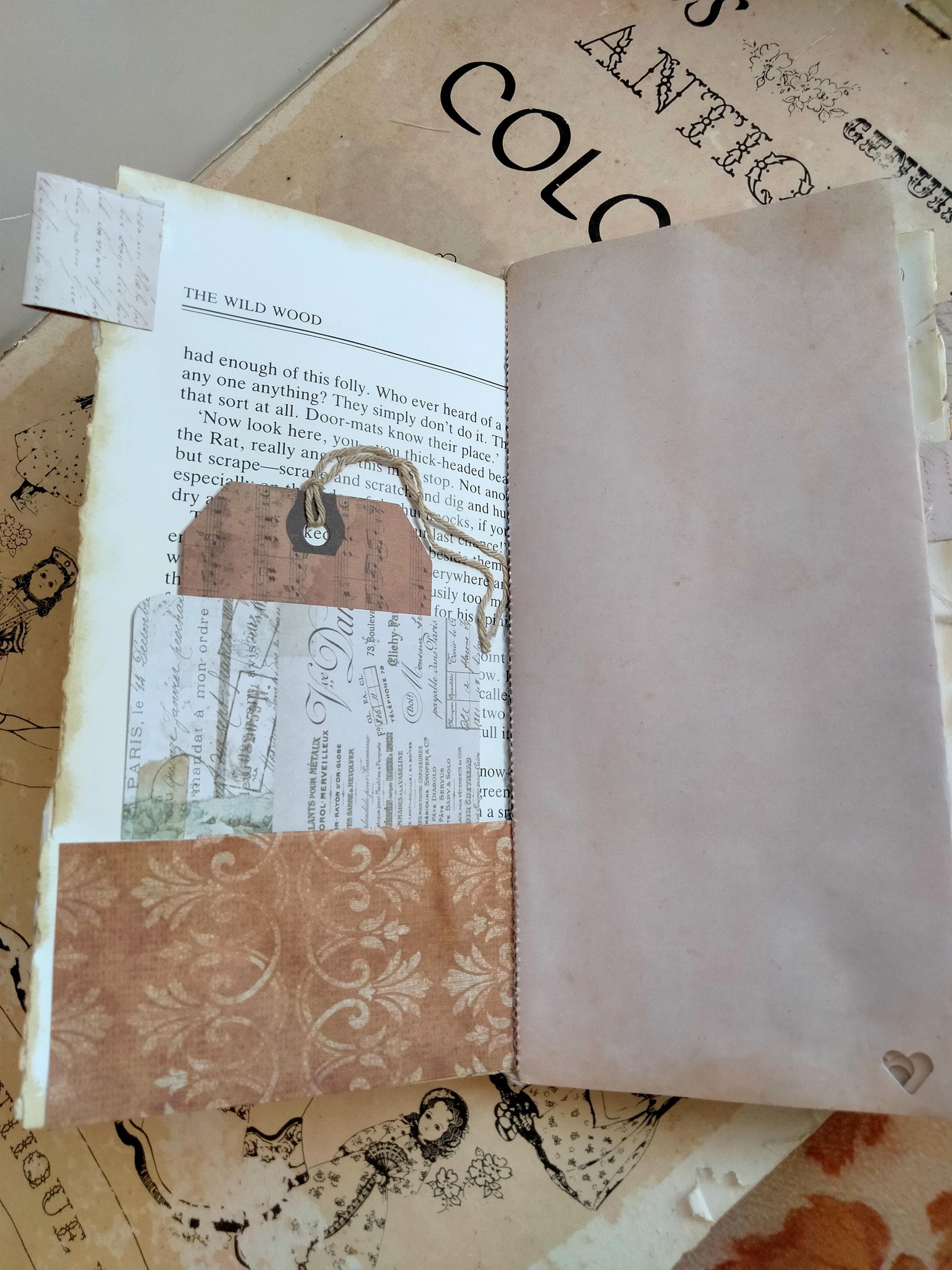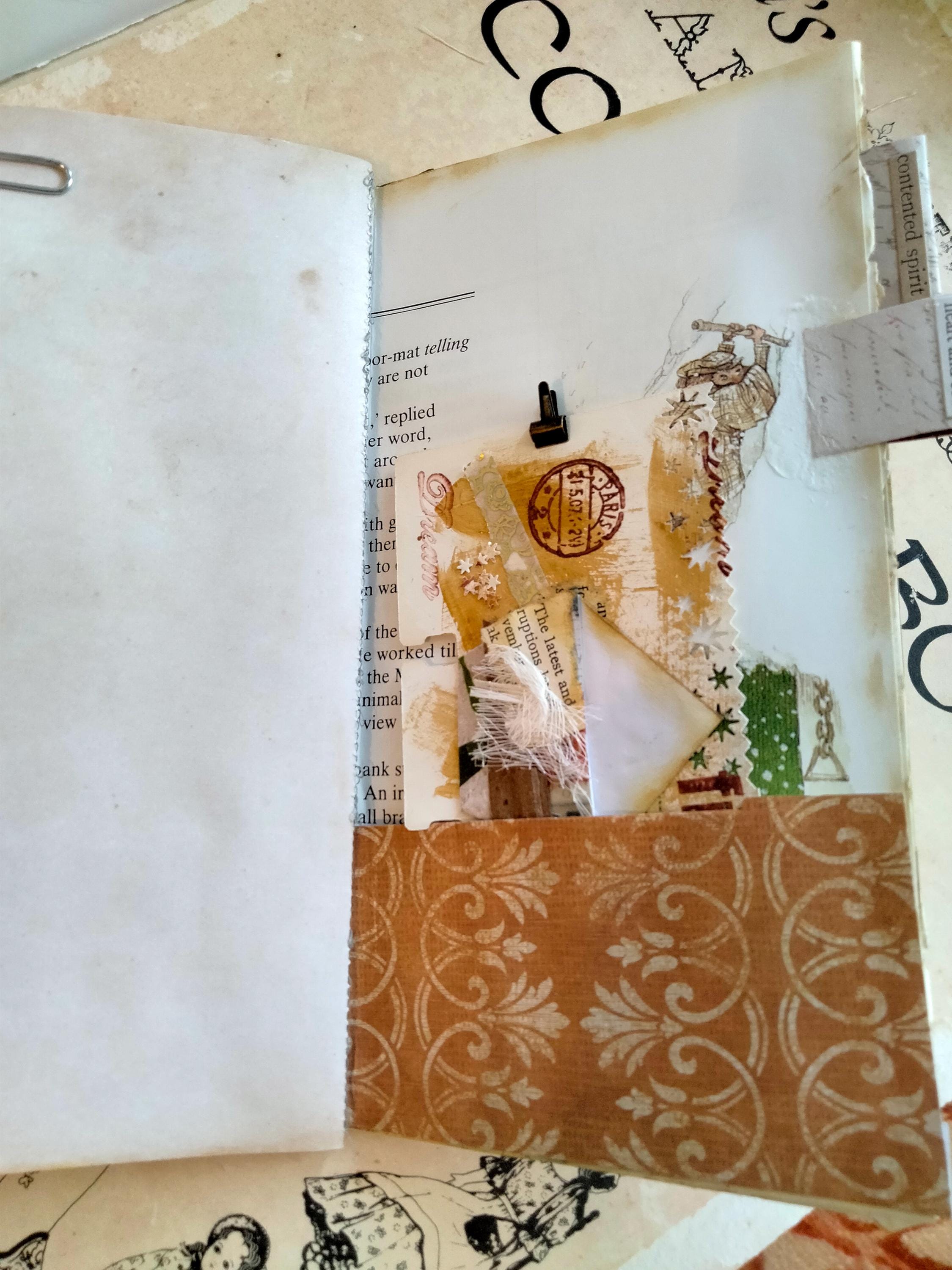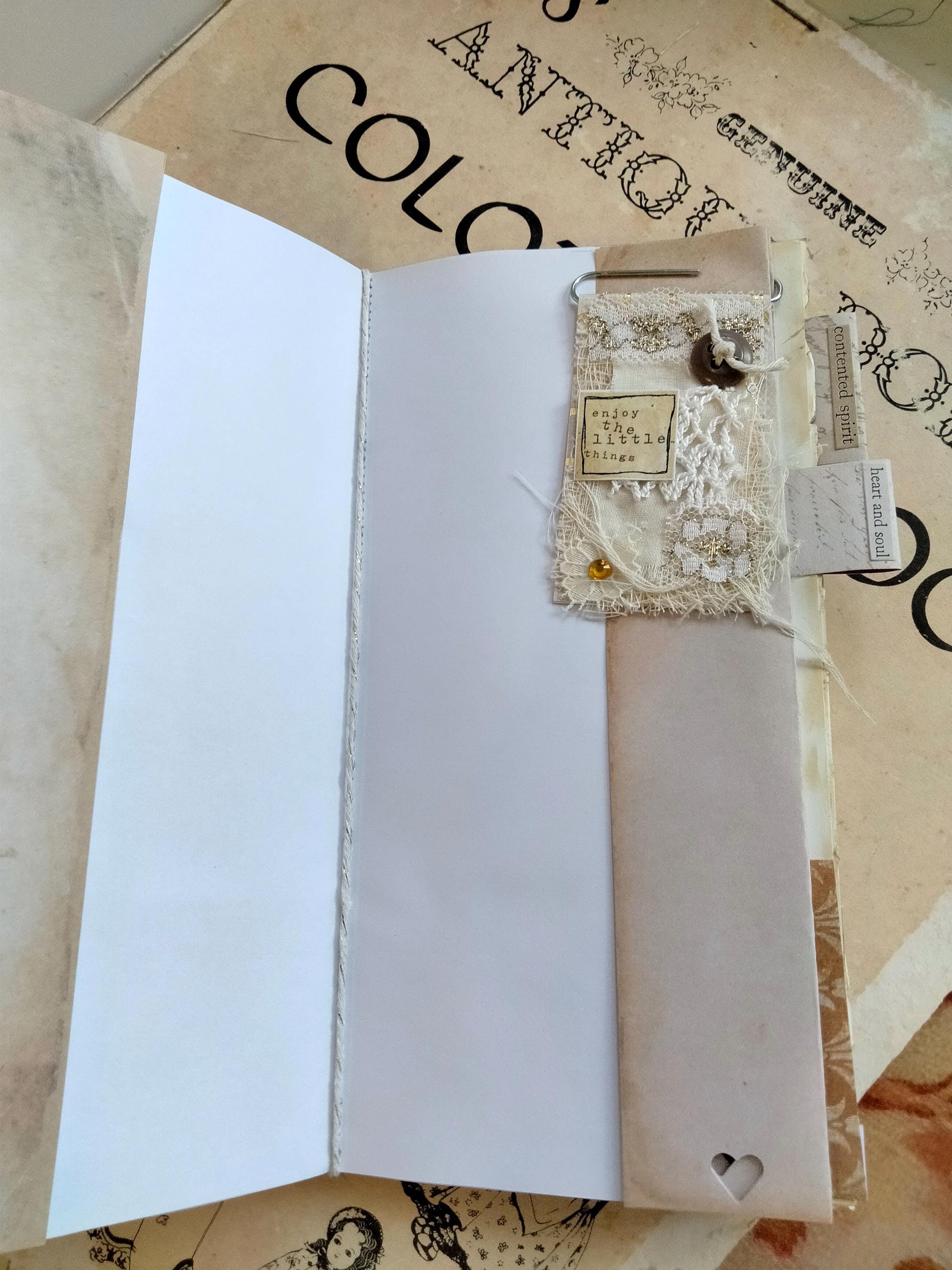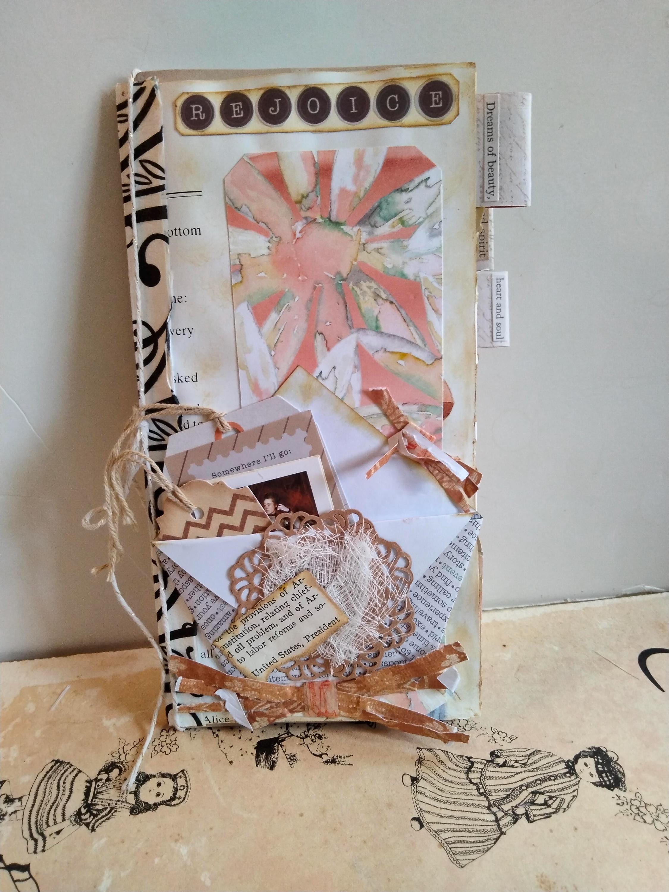 You are getting one (1) handmade traveler's notebook Journal featuring the them: Rejoice! It contains several pockets and tags, and altered paper clip bookmark embellishments for you to use and unlock your creativity and get inspired by whatever opens your heart and makes it sing!