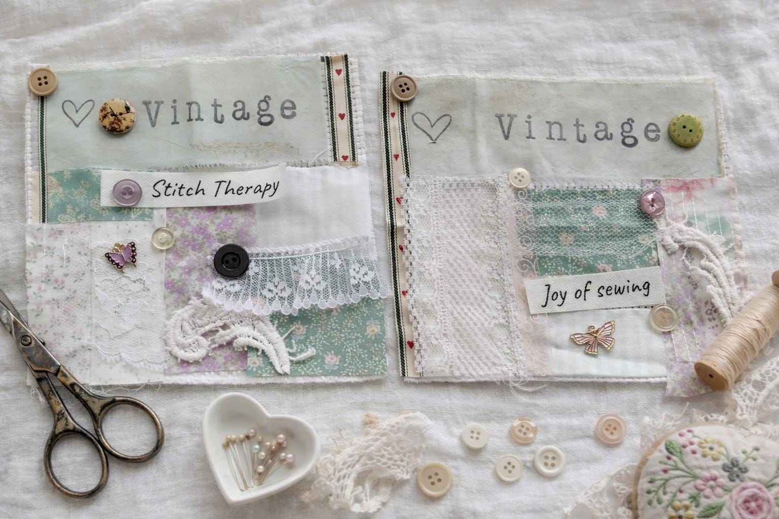 This slow-stitch kit includes a fabric foundation (6 x 6 inches), four (4) buttons, trim, lace, and embroidery floss. One heart cardboard pattern is included. Perfect for you to add to your junk journals, quilt blocks, wall hangings, and so much more.